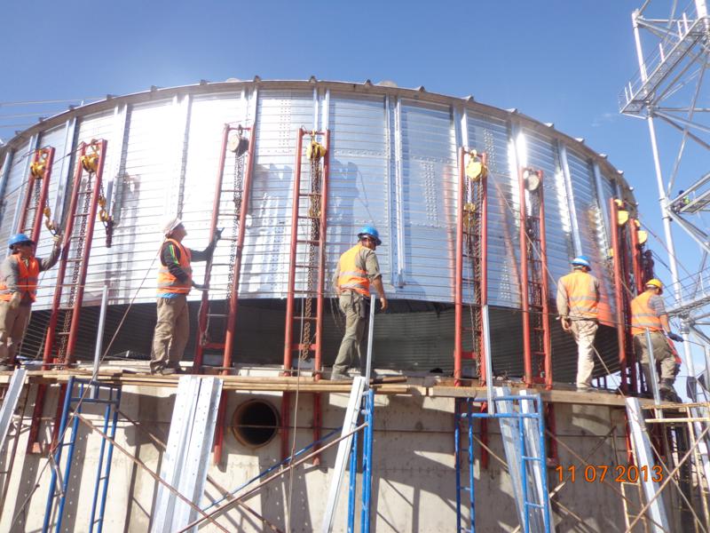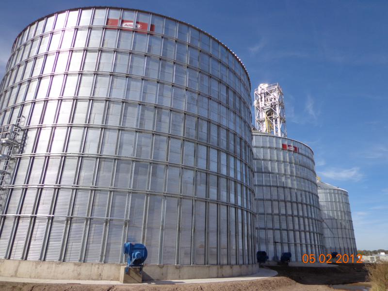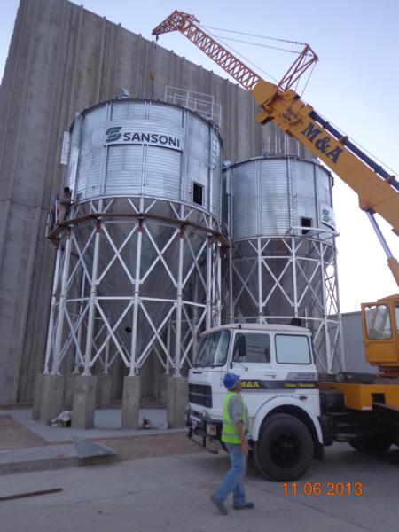 Coordinación de montajes de 4 Silos de 2500 tn, 8 silos cono aéreo a 60º de 250 ton, 2 silos cono aéreos de 200 ton, 5 silos de expedición de 350 m3, para semillas y residuos sobre estructura. 7 Elevadores a cangilones, torre de Norias y 21 transportadores a Cadenas. |